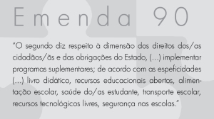 90- O segundo diz respeito à dimensão dos direitos dos/as cidadãos/ãs e das obrigações do Estado, cabendo a este último ampliar a obrigatoriedade da educação básica superior; definir e garantir parâmetros (II, 10) de qualidade, incluindo a igualdade de condições para o acesso e permanência na instituição educativa; definir e efetivar diretrizes nacionais para os níveis, ciclos e modalidades de educação ou ensino; implementar sistemas de avaliação para subsidiar o processo de gestão educativa e para garantir a melhoria da aprendizagem; implementar programas suplementares; de acordo com as espeficidades de cada Estado, Distrito Federaç e Município, dos níveis e modalidades de educação como livro didático, privilegiando recursos educacionais abertos, alimentação (II, 11) escolar, saúde do/da estudante, transporte escolar, recursos tecnológicos livres, segurança nas escolas.