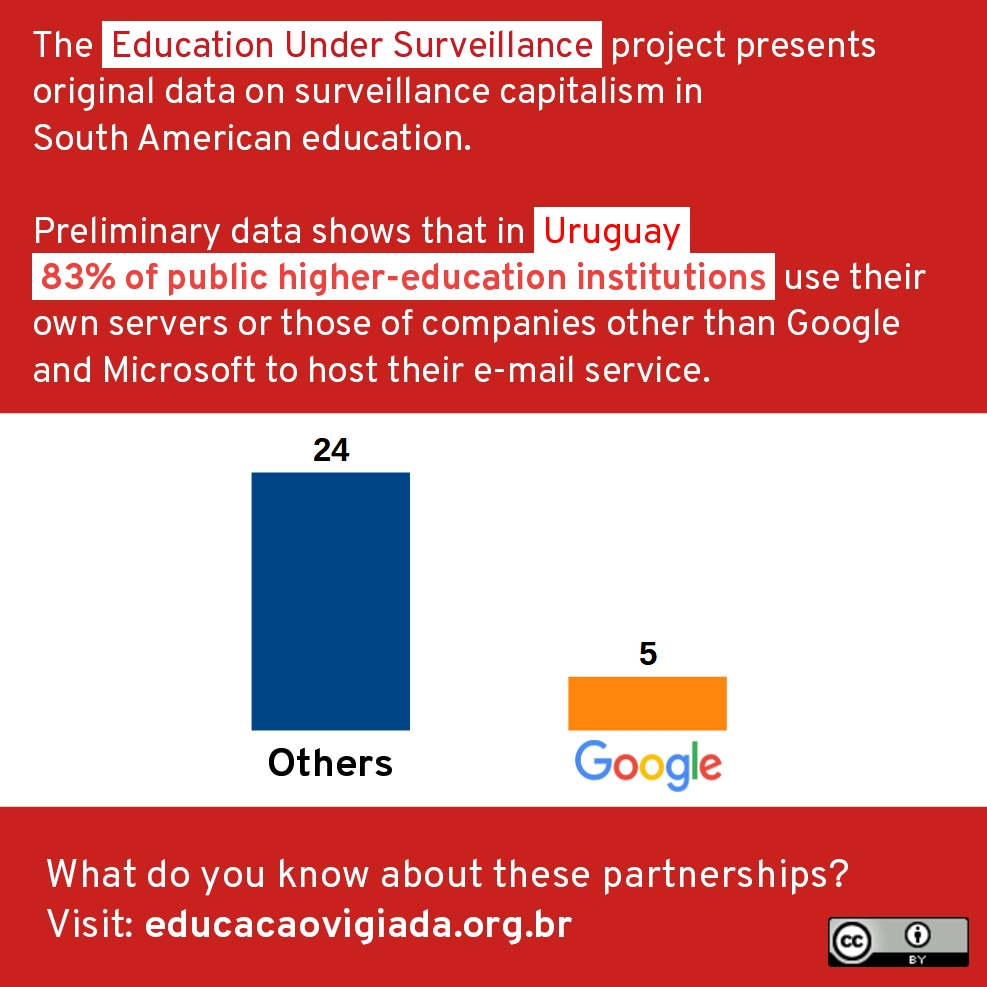 Já no Uruguai, os dados apontam em outra direção: a predominância de alternativas aos servidores das empresas Google e Microsoft. Do total de 29 universidades públicas uruguaias pesquisadas, 83% utilizam servidores próprios ou de outras empresas para hospedar seus serviços de e-mail, e somente 17% (5, no total) utilizam servidores da Google.