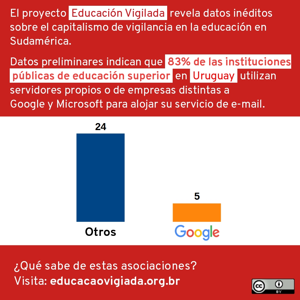 En Uruguay, los datos apuntan en otra dirección: el predominio de alternativas a los servidores de las empresas Google y Microsoft. Del total de 29 instituciones públicas de educación superior uruguayas encuestadas, 83% utilizan servidores propios o de otras empresas para alojar sus servicios de correo electrónico, y sólo 17% (5, en total) utilizan servidores de Google.