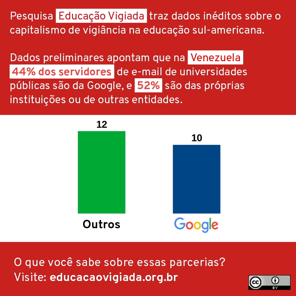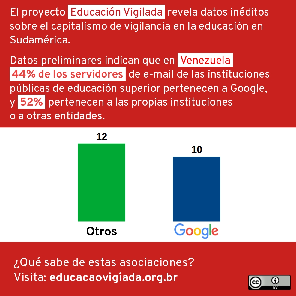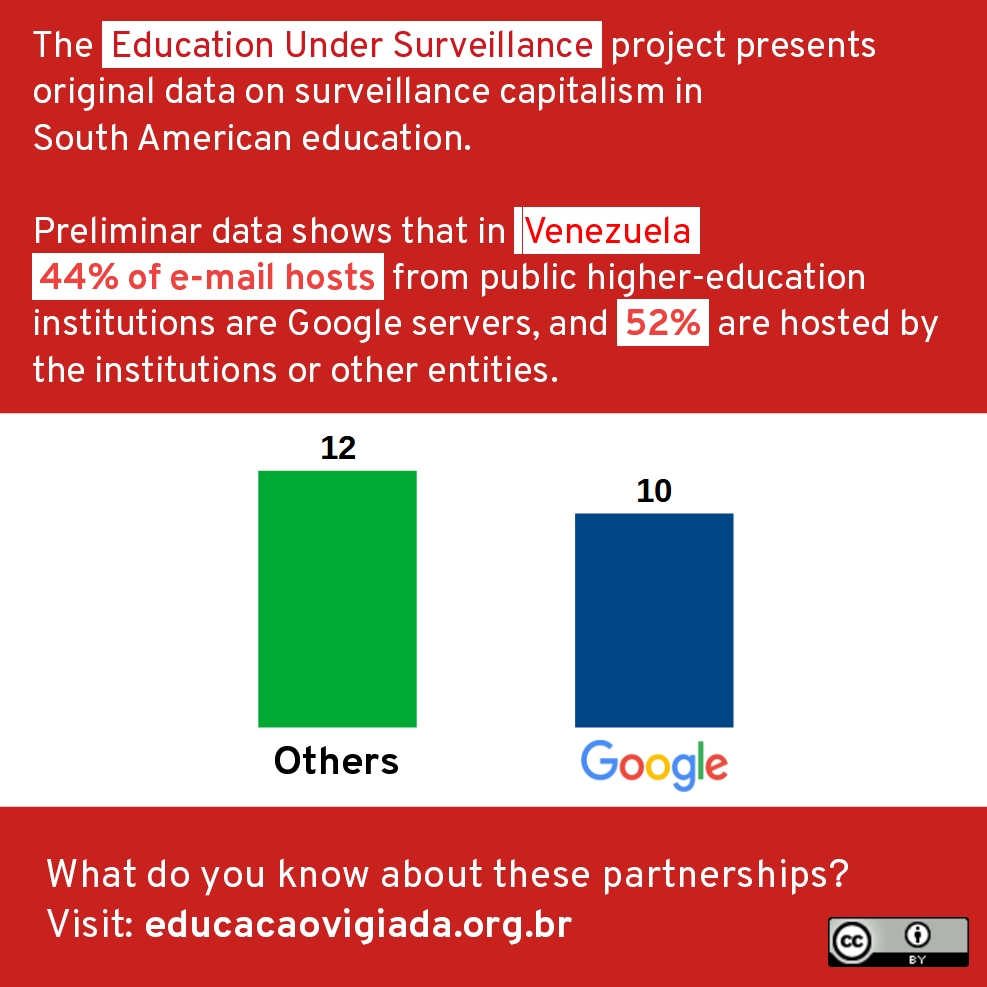 Na Venezuela, dentre as 23 universidades públicas pesquisadas, 10 (44%) hospedam seu serviço de e-mail em servidores da Google e 12 (52%) hospedam em servidores próprios ou de outras empresas (os dados de 1 universidade ainda precisam ser investigados com maior detalhamento).