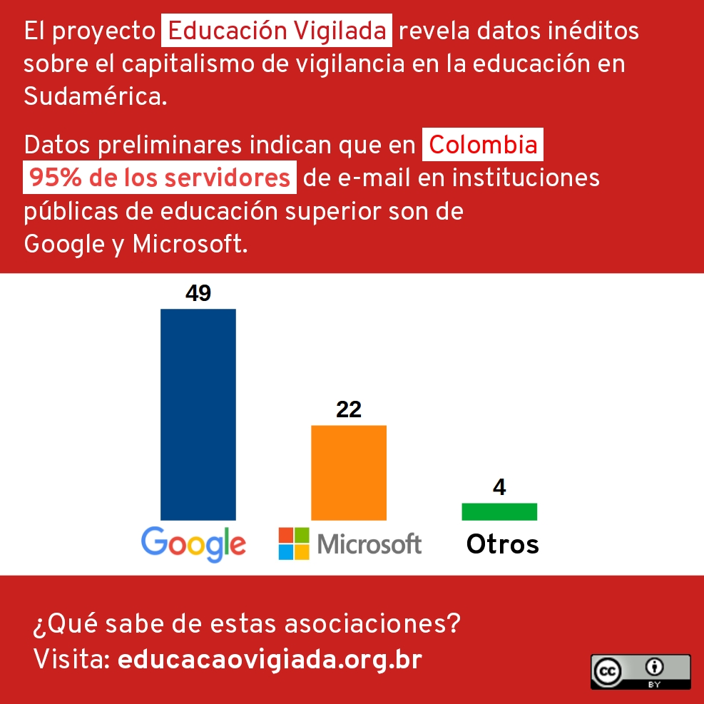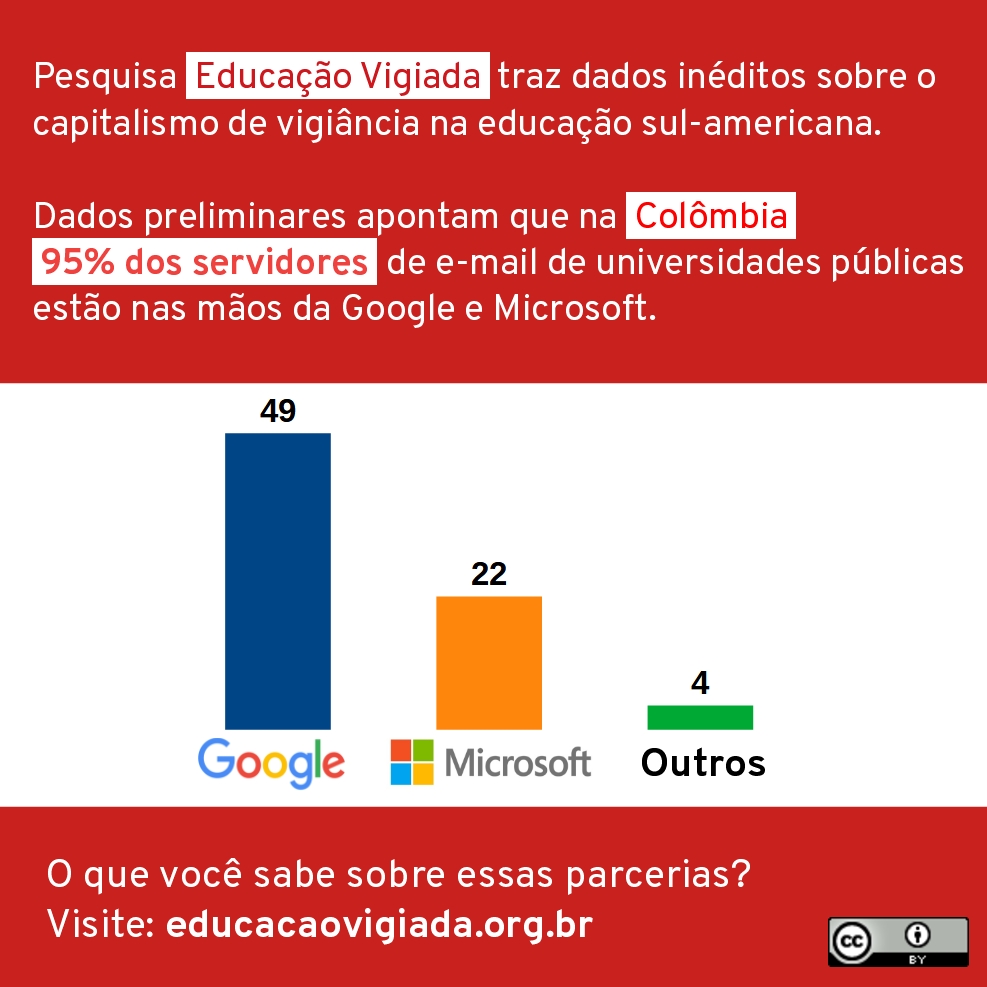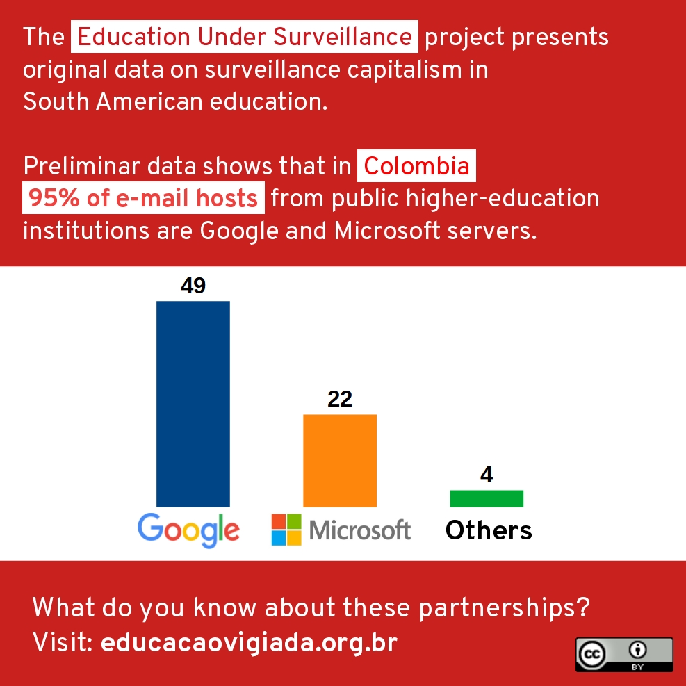 Dados preliminares de pesquisa inédita do projeto Educação Vigiada, realizada pela Iniciativa Educação Aberta em parceria com a Rede Lavits apontam que, na Colômbia, de 75 universidades públicas pesquisadas, somente 4 (5%) tem seus serviços institucionais de e-mails hospedados em servidores que não são da Google (65%) ou da Microsoft (30%).