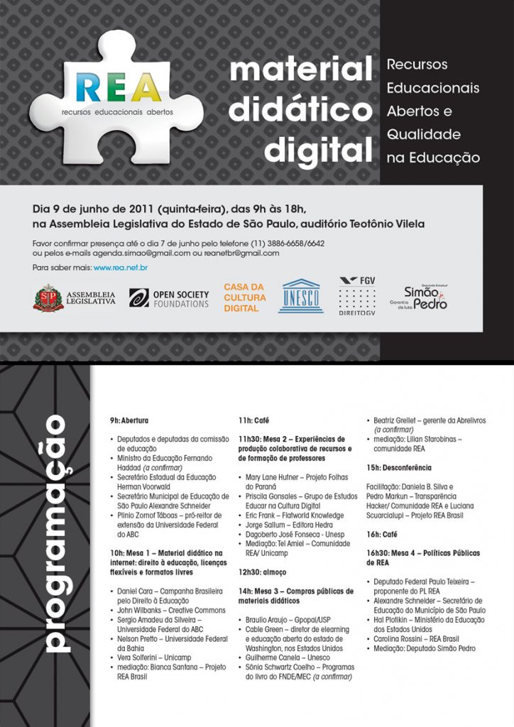 O auditório Teotonio Vilela, na Assembleia Legislativa de São Paulo, permaneceu lotado desde as 10 da manhã, quando começou o seminário REA, até as 18 horas, quando ele se aproximava do final. Educadores, jornalistas, editores, advogados e militantes da internet livre ajudaram a garantir a qualidade dos debates, o que, para o projeto REA Brasil, serve como a indicação dos melhores e mais democráticos caminhos possíveis.